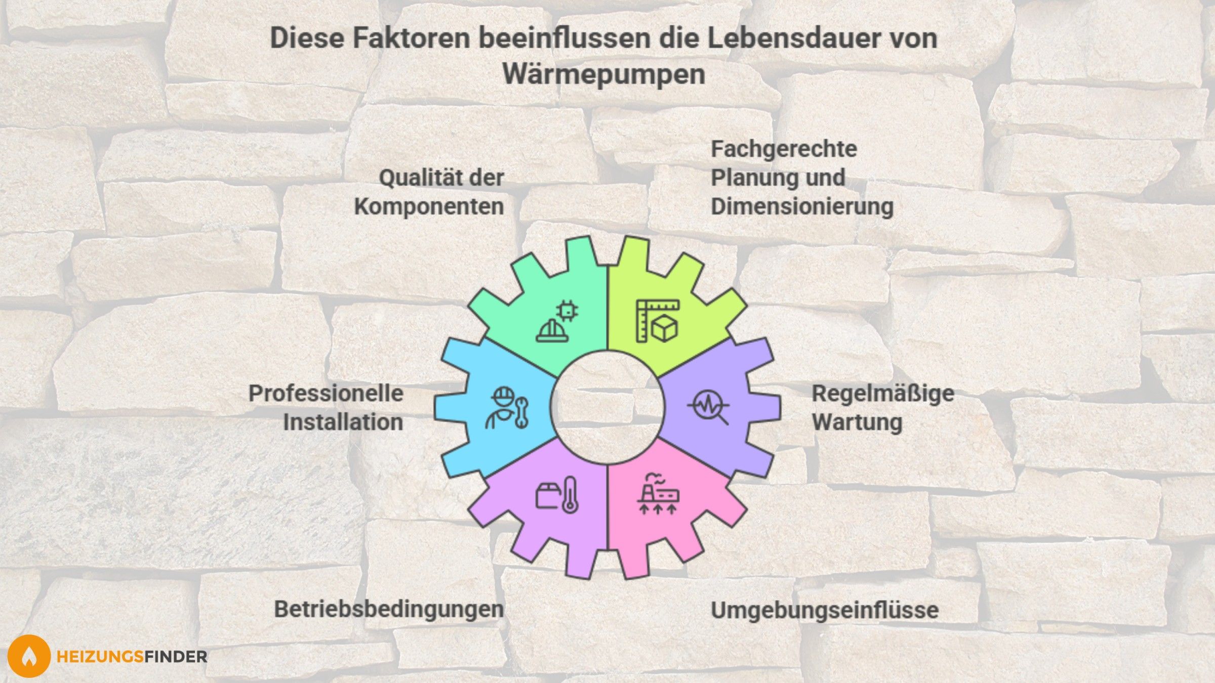 Sechs Faktoren beeinflussen die Lebensdauer von Wärmepumpen. | Grafik: Heizungsfinder.de/KI